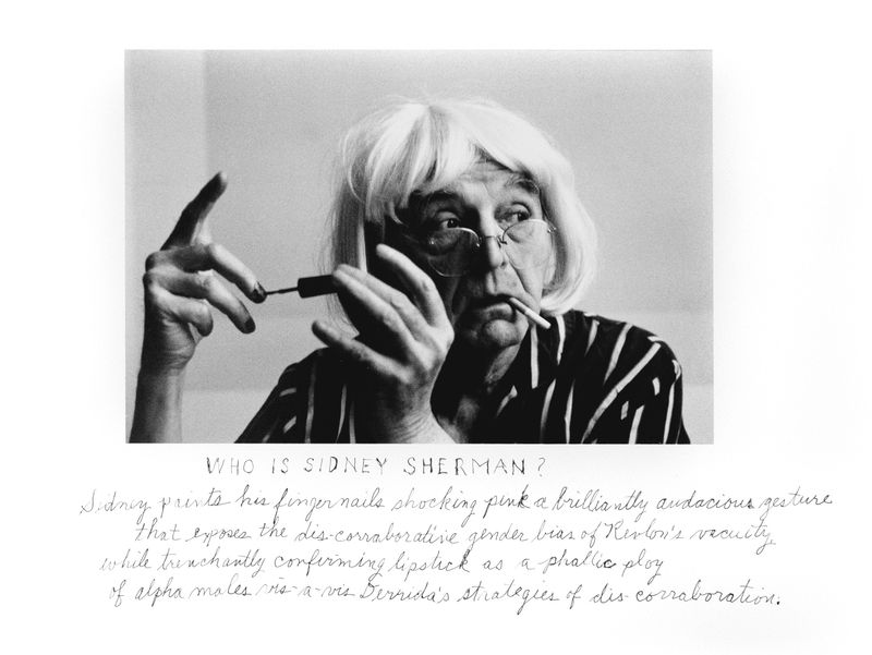 A similarly astute series by Duane Michals pokes holes in the celebrity-centered and self-satisfied notions of the commercial art world: Michals’ photographic self-portraits in disguise, titled Who is Sidney Sherman (2000), offers less-glamorous imagery than the voluminous self-portraiture of 1980’s art-star photographer Cindy Sherman. Scrawled texts below each image mimic the writings of white, straight French philosopher Derrida and make fun of the dense, alienating postmodernist language that has for decades shaped academic prescriptives about how to talk about art.